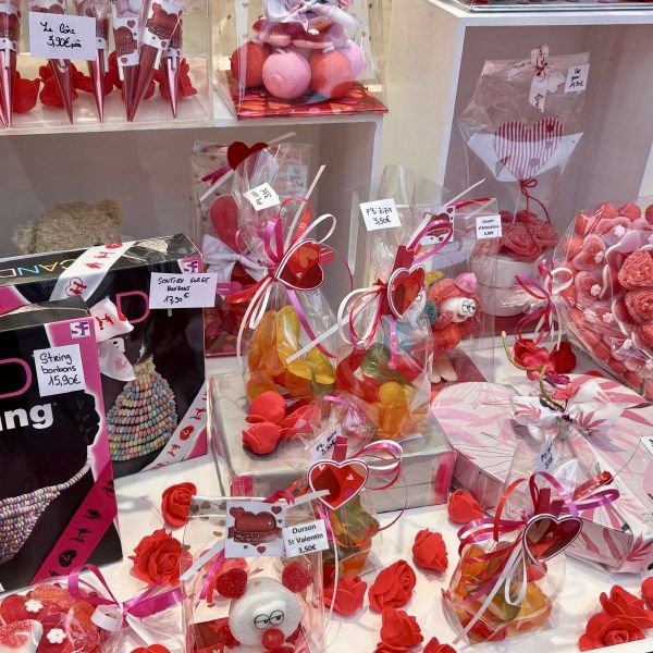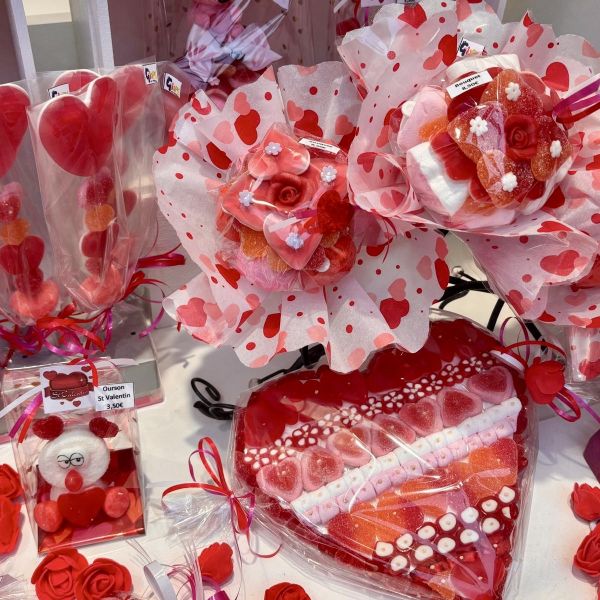 Imaginez un assortiment sucré composé de coeurs à la fraise, à la pêche, des tagadas et des guimauves. Ou encore notre petit ourson "Valentin", qui fera son effet!