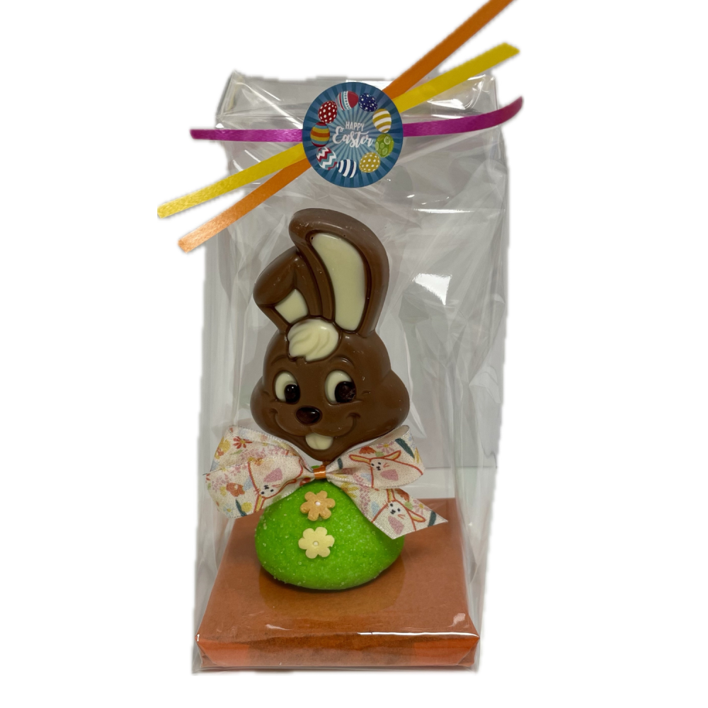 Ingrédients : sirop de glucose, sirop de fructose, sucre, eau, gélatine, graisse végétale E414, albumine de lait solubilisé, E330, E322, humectant E 422, arômes, colorants E100, E120, E132, E133, E160e, E172, présence éventuelle de trace d'oeuf, pâte de noisettes, farine de soja, lécithine de soja, poudre de lait, poudre de cacao, lait entier 20%.